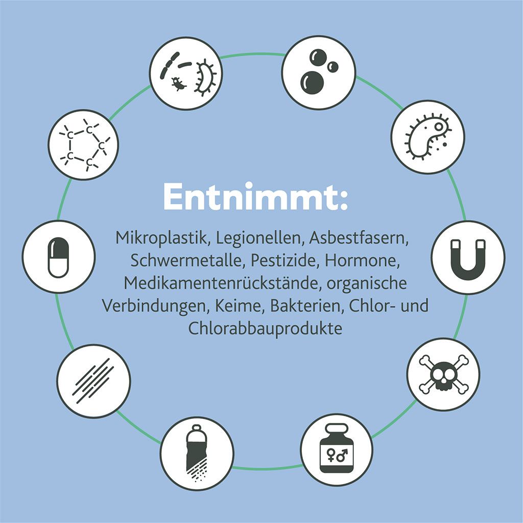 - Aktivkohleblock: Mit einer Filterfeinheit von 1,50 µm entfernt er zuverlässig Chlor, organische Verbindungen, Schwermetalle wie Blei und Kupfer sowie unerwünschte Geruchs- und Geschmacksstoffe.